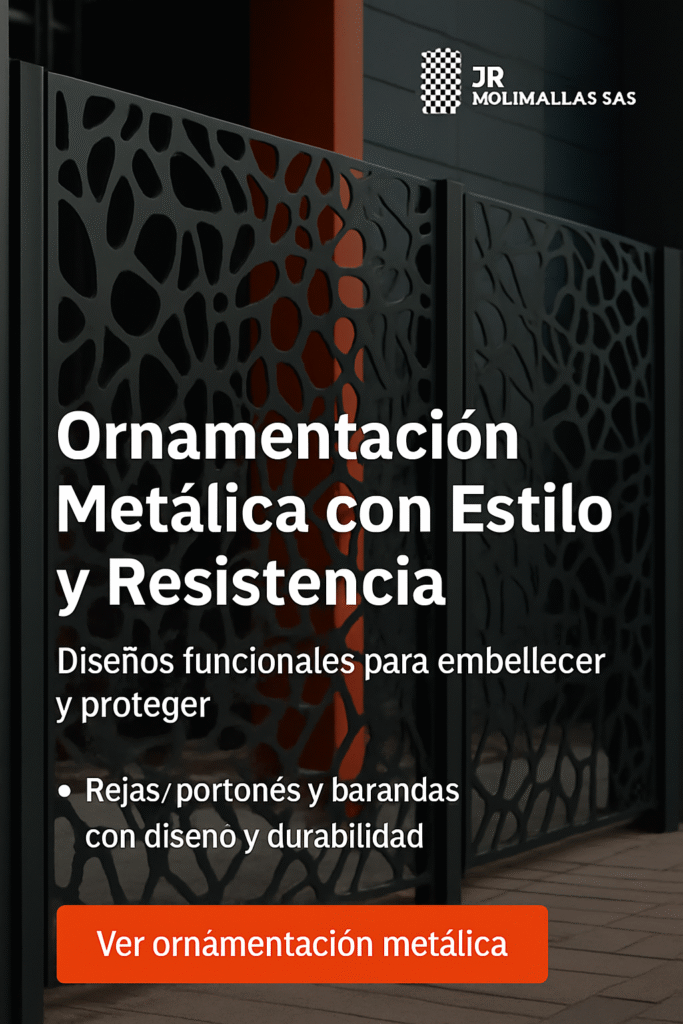 La ornamentación metálica ha dejado de ser solo un recurso funcional. Hoy es también un elemento de diseño arquitectónico que aporta seguridad, estética y personalidad a cualquier espacio. En JRMOLIMALLAS SAS, combinamos calidad, técnica y creatividad para ofrecerte soluciones modernas en hierro forjado, acero y metal personalizado para portones, rejas, barandas y estructuras decorativas. En […]