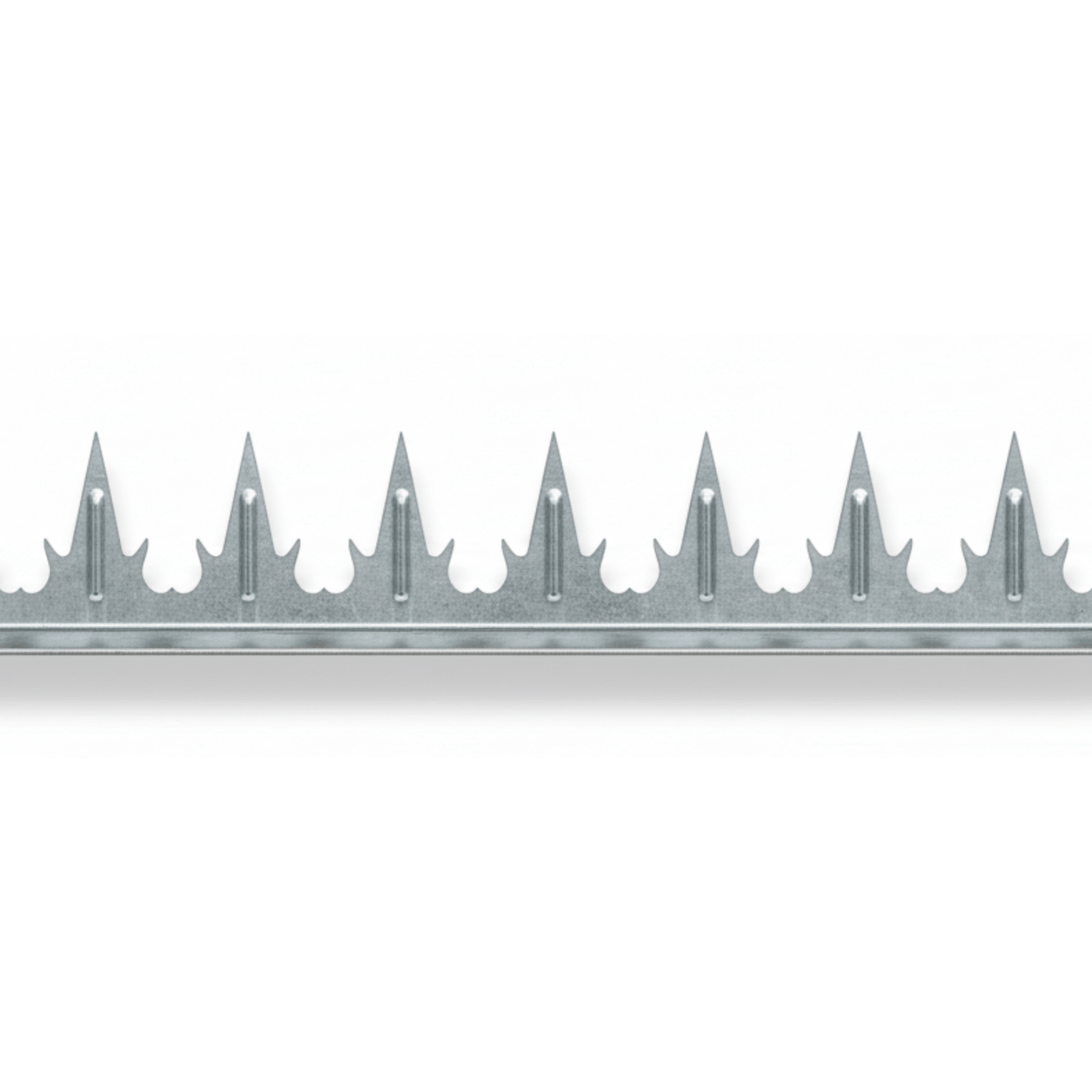 Estilete metálico tipo cuchilla en forma de chusos, fabricado con recubrimiento en zinc para mayor protección contra la corrosión. Cuenta con orificios que permiten instalarlo fácilmente con chazos o tornillos, y su función es reforzar la seguridad en cerramientos, actuando como elemento anti-intrusión en la parte superior de muros o estructuras metálicas.