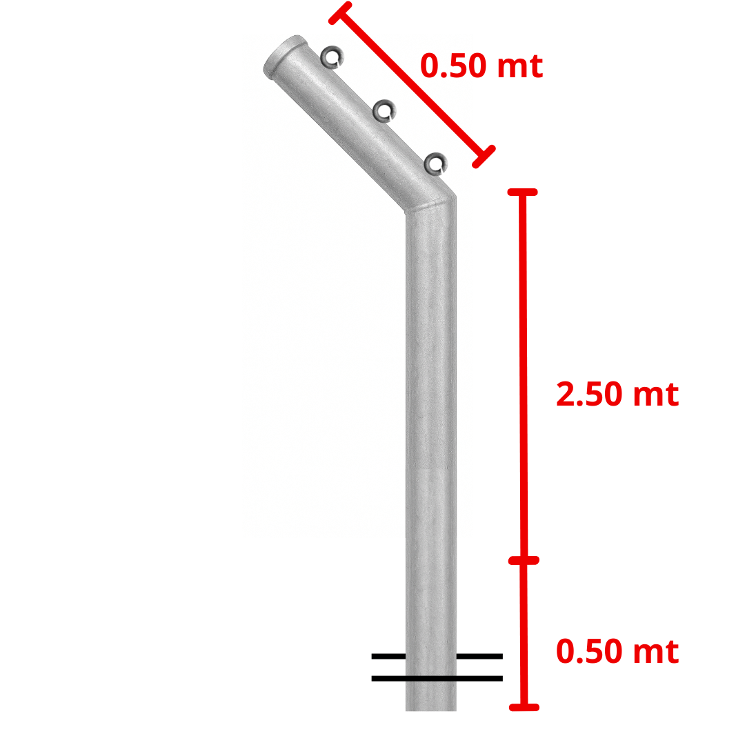 Poste elaborado en tubería galvanizada calibre 18, ideal para cerramientos en malla eslabonada y cercas de alta seguridad. Incluye tapa superior, 2 varillas de anclaje y un ganso fabricado con una tubería adicional inclinada a 45°, de 0,50 metros de largo, ubicada en la parte superior. El ganso trae 3 argollas para la instalación de alambre de púas o concertina, ofreciendo una protección extra y mayor resistencia al ingreso no autorizado. Su acabado galvanizado garantiza durabilidad y resistencia a la corrosión.